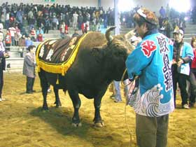 「成人記念闘牛大会の横綱戦を制した鮫島号」